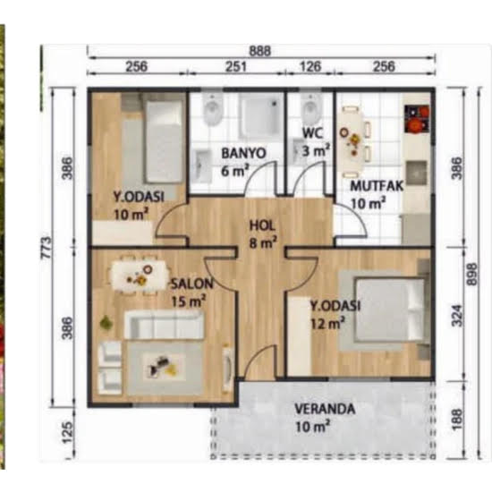 Проект за сглобяема къща с площ от 74 кв.м. с две спални, хол, кухня, баня, тоалетна + веранда.