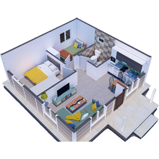 Проект за сглобяема къща с площ от 45 кв.м. с две спални, хол с кухня и баня с тоалетна + веранда.