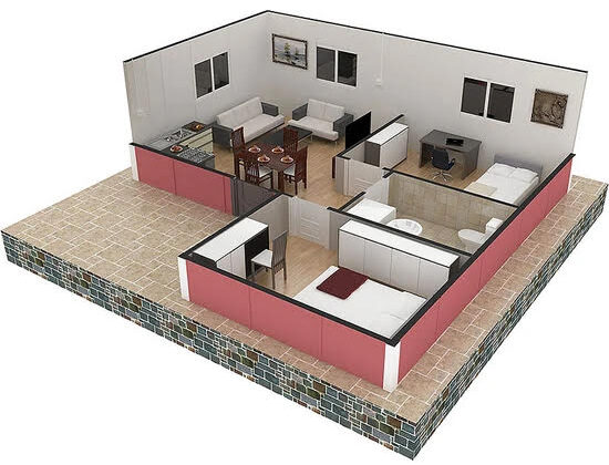 Проект за сглобяема къща с площ от 49 кв.м. с две спални, хол с кухня и баня с тоалетна + веранда.